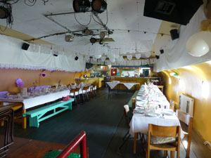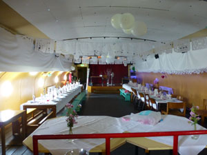 De zaal is voorzien van een klein podium met bescheiden lichtinstallatie,